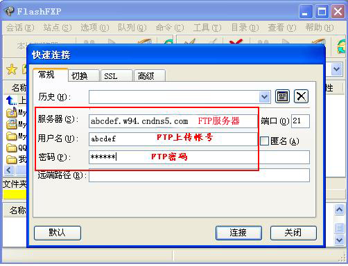 2.在彈出窗口處,輸入 “服務器IP地址、 FTP用戶名、FTP密碼”,然后點 “連接”